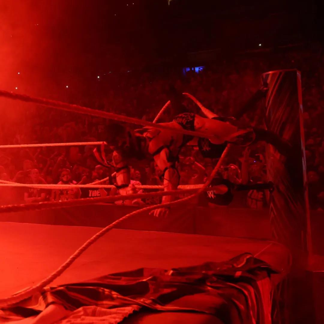 当他再次踏上边柱准备用恶魔飞踏拿下胜利时,上绳突然无故断裂,这也让罗门找到机会,凭借飞冲肩锁定胜局,捍卫全球冠军头衔!