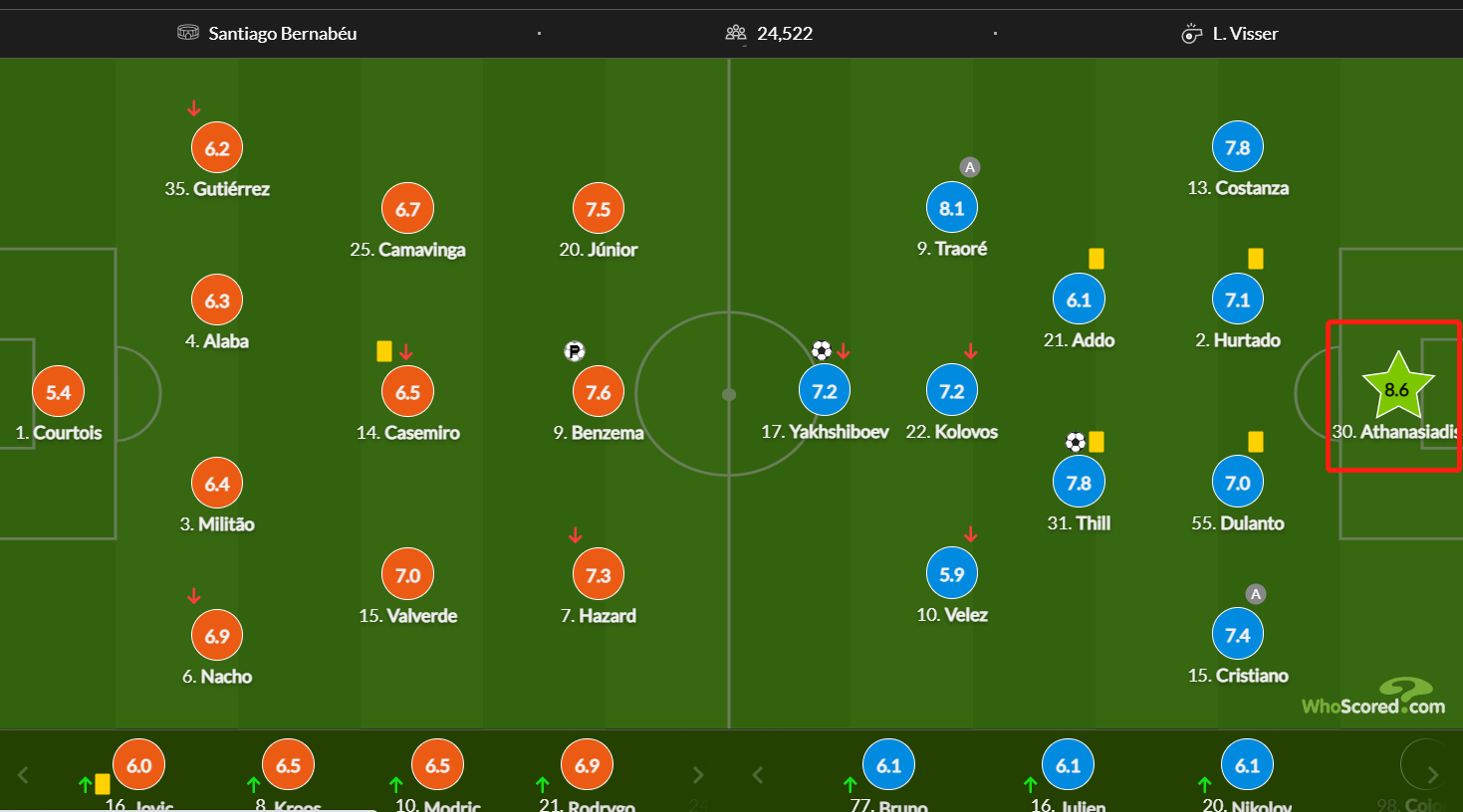 本场比赛阿萨纳夏季斯贡献10次扑救,赛后Whoscored给他的评分高达8.6分,全场最高。