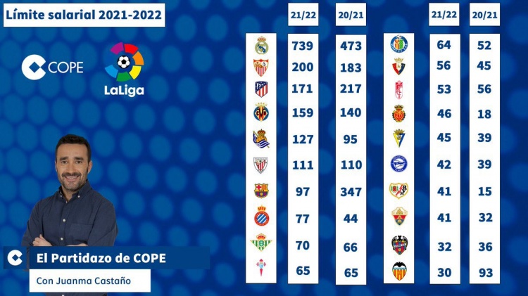 本周,西甲联盟将公布各队新赛季工资帽。据科贝电台透露,由于负债过多,巴萨21/22赛季工资帽已经跌至不足1亿欧元,仅为皇马的1/8左右。