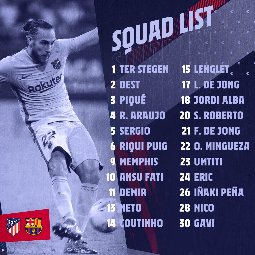 中场:5-布斯克茨、6-普吉、16-佩德里、20-罗贝托、21-弗朗基-德容、28-尼科-冈萨雷斯、30-加维