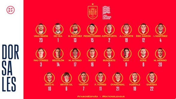 西班牙国家队公布了最新一期大名单中球员各自的球衣号码——其中,刚刚递补入队的巴萨中场罗贝托意外获得了10号,而首次入选国家队的巴萨超新星加维则将身穿9号战袍,而右后卫波罗则穿上了此前属于拉莫斯的15号球衣。