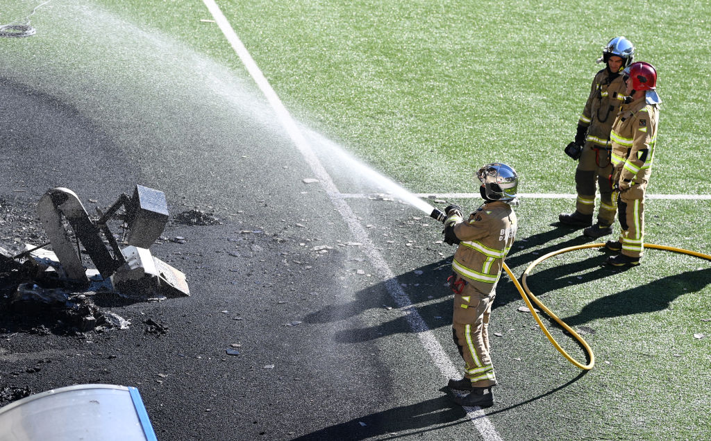 在出现火情之后,一辆消防车迅速赶到现场,多名消防员迅速将大火扑灭。球场内的清理以及设备更换工作在安道尔球员训练期间进行,而损坏的草皮则将在比赛开始前一个小时进行更换。据悉,导致火灾发生的原因尚不明确。