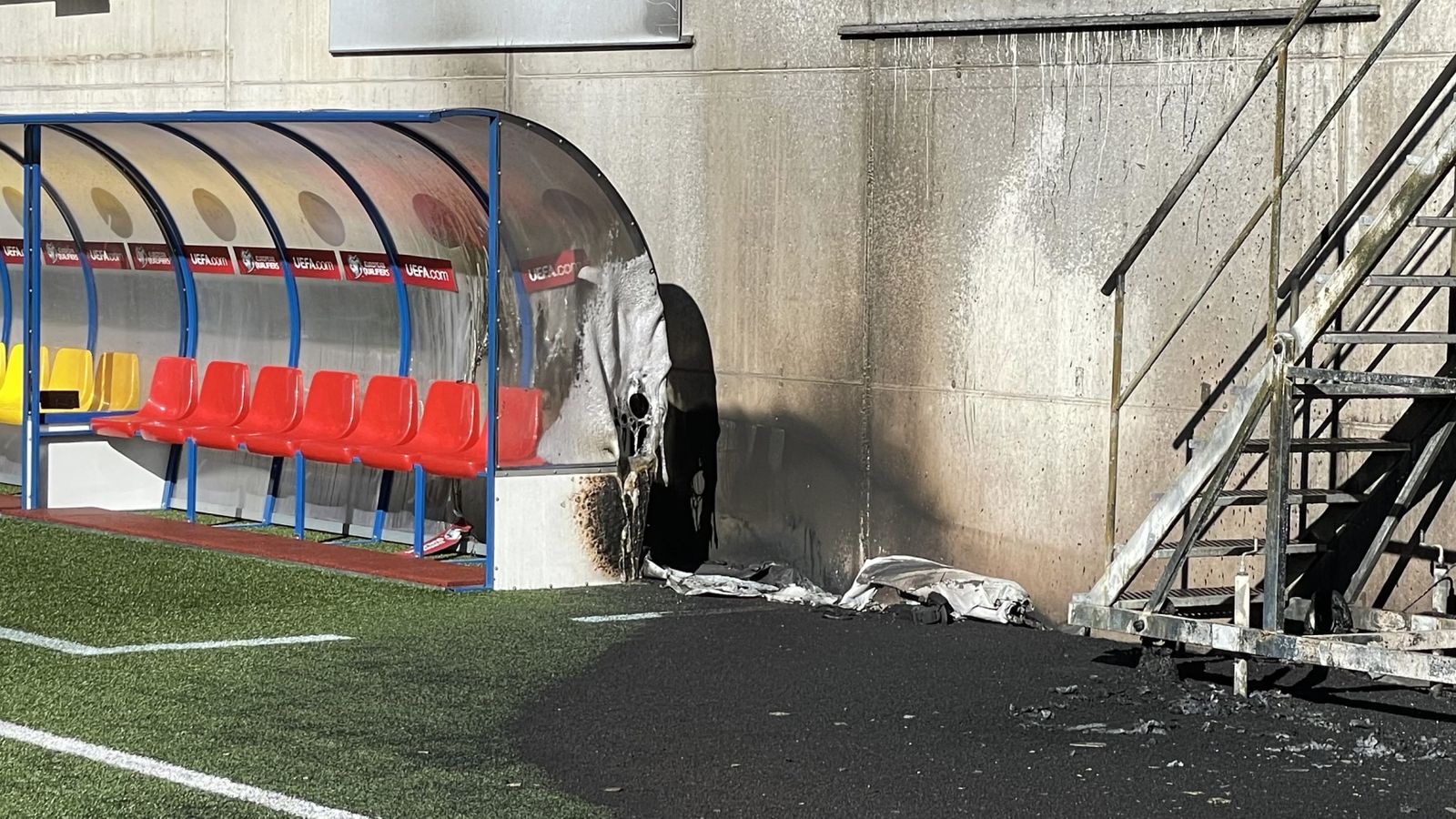 火灾发生后的球场,替补席的部分顶棚被烧毁,技术区的草皮已经面目全非。