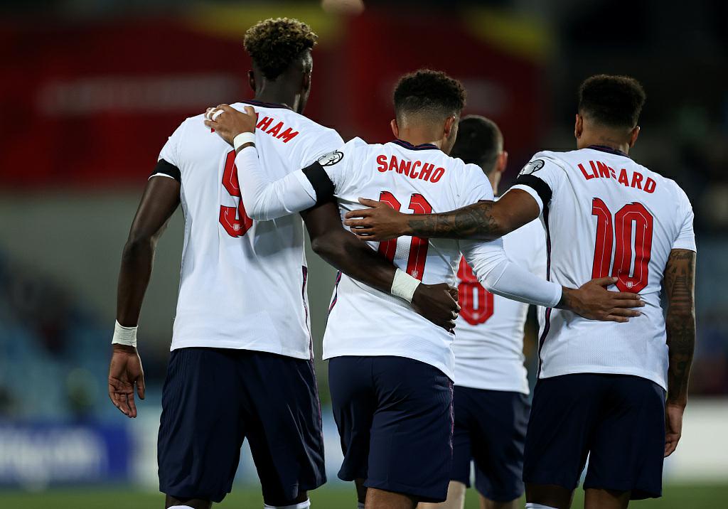 2022世界杯欧洲区预选赛I组第7轮——英格兰客场5-0血洗安道尔:上半时,桑乔门前回敲助攻本-奇尔韦尔推射攻入国家队生涯处子球首开记录,菲尔-福登写意挑传,萨卡小角度抽射再下一城。下半时,桑乔左路传中再送助攻,亚伯拉罕反越位成功门前捅射锁定胜局,替补登场的格拉利什赢得点球,沃德-普劳斯主罚被扑出后补射中的;最后时刻,约翰斯通手抛球发动快攻,格拉利什长途奔袭上演一条龙破门锦上添花。