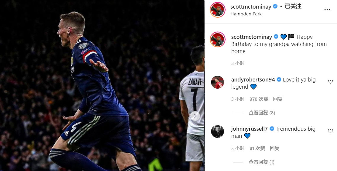 这是麦克托米奈代表苏格兰出战的第27场比赛,以这样戏剧性的方式收获了国家队生涯的首个进球。本场比赛过后,苏格兰巩固了小组第二的位置,和以色列的分差拉开到4分,麦克托米奈的绝杀或许也将决定球队冲击世界杯的命运。