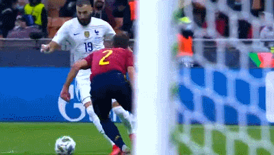 比赛下半场西班牙先拔头筹,但在奥亚萨瓦尔打入进球后不足两分钟,本泽马就在禁区前沿轰入了一记无解的兜射,皮球犹如弯刀出鞘,在空中划过一道美妙的弧线以后飞向大门死角,门将乌奈-西蒙尽管已经摸到了皮球,却也无力阻止皮球入网。