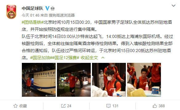 北京时间10月15日00:20,中国国家男子足球队全体抵达苏州驻地酒店,并开始按照防疫规定进行集中隔离。