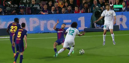 下半场比赛,梅西用一记左脚弧线球帮助巴萨再次领先,然而为他传球的苏牙在抢球时有明显犯规动作,被裁判无视;随后贝尔的不停球抽射令特尔施特根望球兴叹;第76分钟,全场最大争议一幕出现,马塞洛禁区内倒地,裁判仍然毫无表示。但根据慢镜回放,阿尔巴踢到了他的护腿板。
