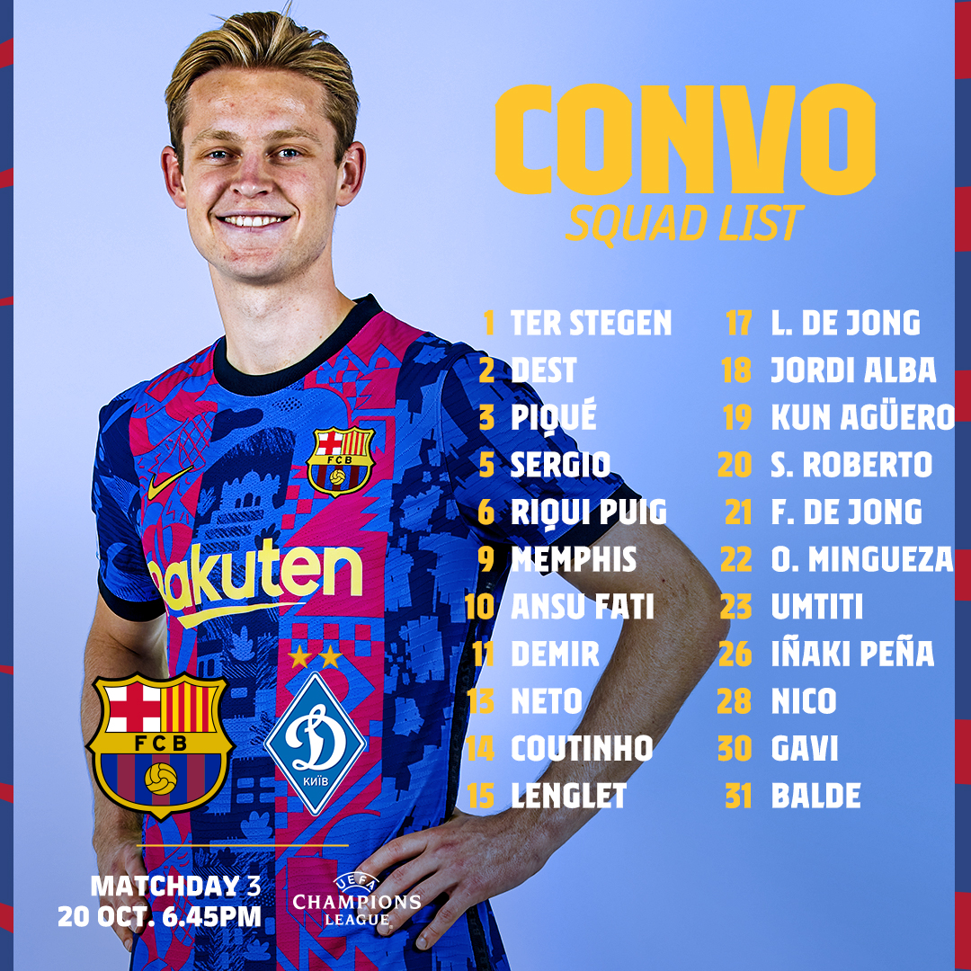 北京时间10月21日凌晨00:45,欧冠小组赛第三轮,巴萨主场对阵基辅迪纳摩。巴萨已经公布了本场比赛的大名单,德佩、法蒂领衔,双德容、阿圭罗在列,阿劳霍、佩德里、登贝莱以及布莱斯维特伤缺,埃里克-加西亚因红牌停赛。