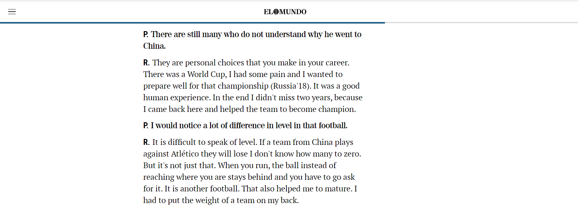 随后该记者提问道:“那里(中国)的足球水平和这里是不是有很大的差别?”卡拉斯科说:“很难说清楚那里的足球水平。如果一支中国的球队和马竞比赛,他们会输并且我很难预测马竞会以几比零的比分拿下比赛。并且,在那里当你跑位的时候队友不会主动给你传球,而是会在后面倒脚,你还得主动要球。不过这也让我成长了 ,让我学会了怎么当一个球队领袖。”