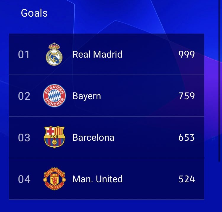 本场比赛前,皇马欧冠历史共打进994粒进球,一场5-0的大胜后,这个纪录来到了999粒,距离1000粒欧冠进球这一历史性时刻仅差一步之遥。