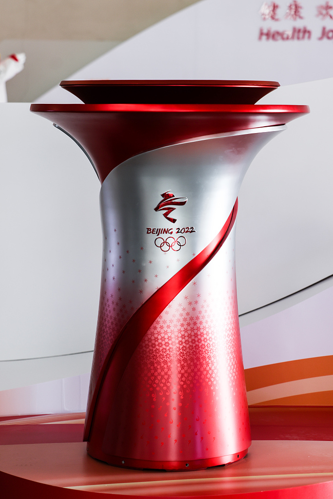 北京冬奥会仪式火种台以“承天载物”为设计理念,创意灵感来自中国传统青铜礼器——尊,造型风格与火炬、火种灯和谐一致。仪式火种台采用了尊的曲线造型,基座沉稳,象征“地载万物”。顶部舒展开阔,寓意着迎接纯洁的奥林匹克火种。祥云纹路由下而上渐化为雪花,象征了“双奥之城”的精神传承。红色丝带飘逸飞舞、环绕向上,与火炬设计和谐统一。红银交映的色彩,象征了传统与现代、科技与激情的融合。