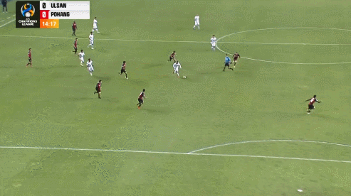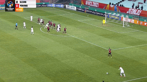第45分钟,蔚山获得一个不错的前场定位球机会,李东炅将球吊向禁区后点,可惜尹日錄未能碰到皮球。