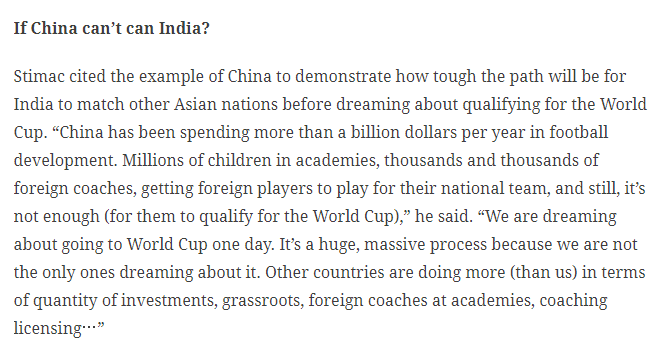 “中国每年在足球发展上的花费超过 10 亿美元。他们目前有几百万名小球员接受良好的青训,数以万计的外国教练为他们工作,但这还不够(仍不足够让他们有资格参加世界杯)。”