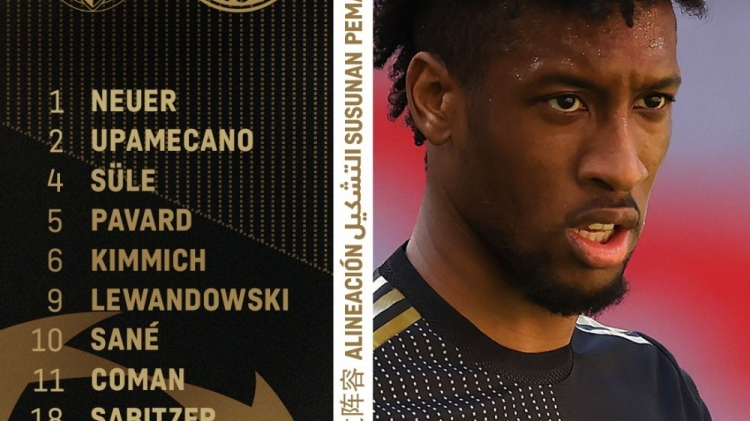 拜仁首发:1-诺伊尔、21-卢卡斯、2-于帕梅卡诺、4-聚勒、5-帕瓦尔、6-基米希、18-萨比策、25-穆勒、10-萨内、11-科曼、9-莱万