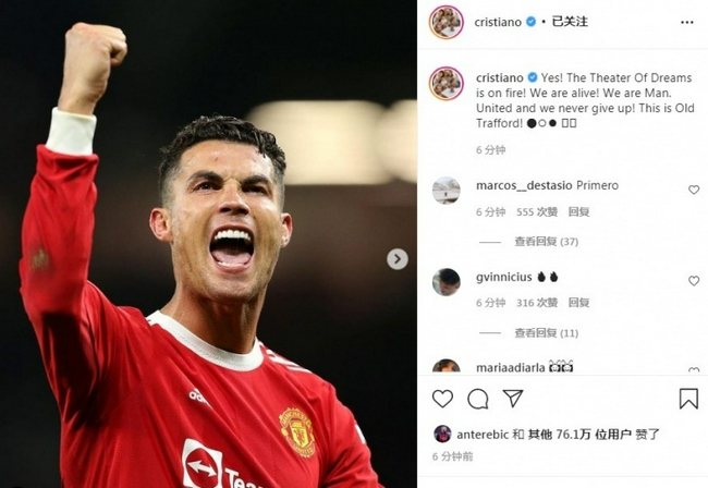赛后,C罗也更新了自己的社交平台账号,他在INS上写道:“yes!梦剧场激情燃烧,我们生龙活虎!我们是曼联,我们永不放弃!这就是老特拉福德。”