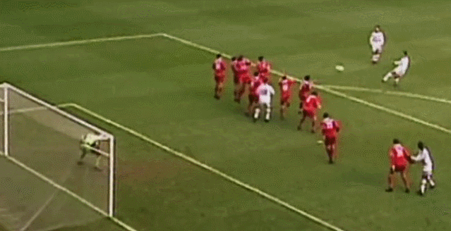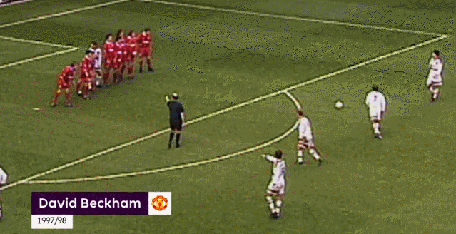 而就在1个赛季之后,随着坎通纳的退役,贝克汉姆也正式接过了他所留下的7号衣钵。在1997/98赛季英超客场对阵利物浦的比赛中,安迪-科尔进球为曼联取得领先,罗比-福勒命中点球扳平,贝克汉姆则利用一次禁区前沿右侧任意球的主罚机会以一记标志性的圆月弯刀划破安菲尔德天际直挂死角破门,为球队2-1再度超出比分,随后安迪-科尔梅开二度锁定胜局,“贝氏弧线”就此定格在了安菲尔德的漫长记忆之中。