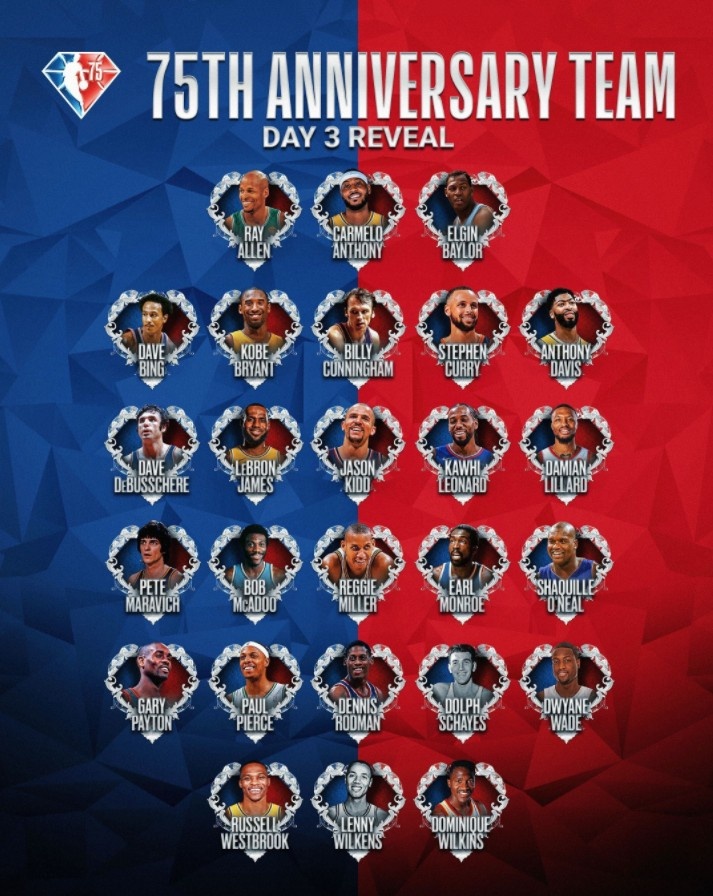 多米尼克-威尔金斯、丹尼斯-罗德曼、雷-阿伦、德维恩-韦德、贾森-基德、科比-布莱恩特、加里-佩顿、鲍勃-麦卡杜、保罗-皮尔斯、雷吉-米勒(以上为退役球员)