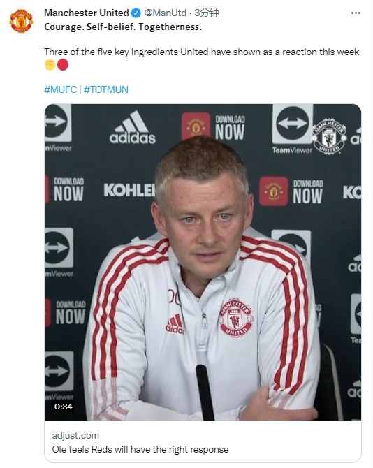 北京时间10月29日,曼联官方推特发布索尔斯克亚的赛前发布会视频,并配问道:“勇气 自信 团结 这是曼联本周的反应所展现出现的关键特质。”