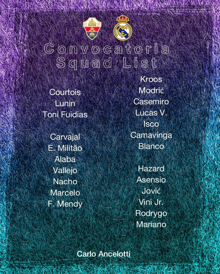 今晚20:00西甲第12轮,皇马将前往客场对阵埃尔切,赛前球队公布大名单。本泽马确诊,伊斯科、莫德里奇回归,巴尔韦德等人继续因伤缺阵。据了解,本泽马赛前没有参加室外合练,但并没有受伤,落选大名单的原因是安切洛蒂令其轮休。