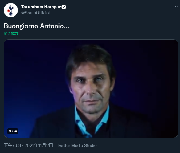 热刺官方最早在北京时间19时43分发布了孔蒂手持热刺球衣的官宣照,但随即将此消息删除。而在北京时间晚20时整时,热刺官方发布了一条17秒的视频,并用意大利语写道:“早上好,安东尼奥!”