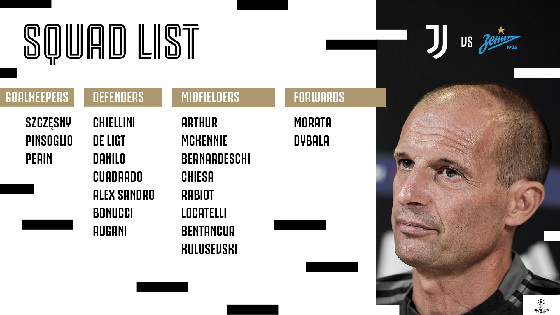 北京时间11月3日凌晨4时,欧冠小组赛H组第4轮,尤文图斯主场迎战泽尼特。斑马军团公布了本场比赛的大名单,莫拉塔、迪巴拉领衔,小基耶萨出战。