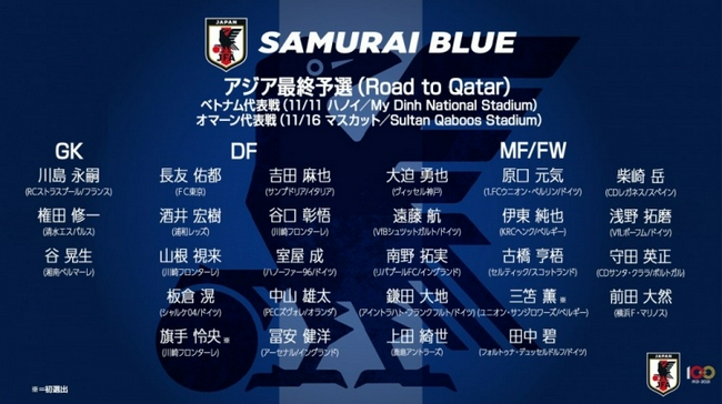 北京时间11月4日中午,日本男足国家队公布了最新一期的球队大名单,他们将在11月份即将到来的世预赛亚洲区12强赛中先后迎战越南和阿曼。在这份大名单中,三笘薰首次入选,镰田大地、南野拓实、富安健洋、古桥亨梧和伊东纯也等名将悉数在列。
