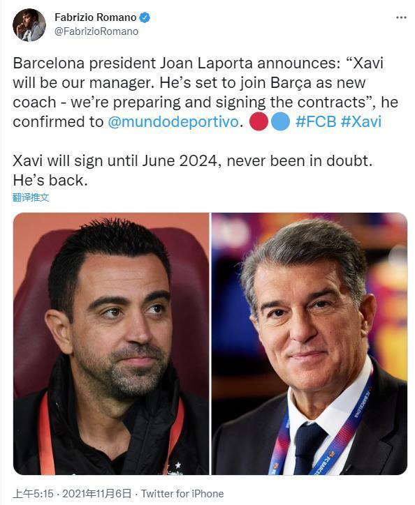 据悉拉波尔塔公开表示:“哈维将成为我们的新任主教练,我们正在签署合同。”此外据记者罗马诺透露,哈维与巴塞罗那将签约到2024年6月。