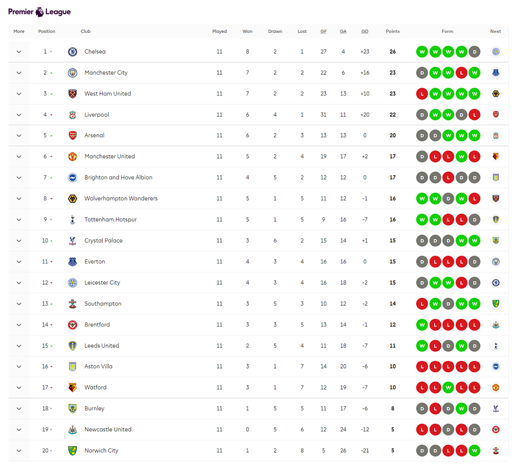本轮过后,切尔西仍旧位居榜首并领先第二名3分,但曼城上升至了第二位,西汉姆联与曼城同积23分但因净胜球劣势排在第三,利物浦跌至第四,阿森纳持续爬升到了第五,在积分榜上反超曼联。保级区,诺维奇虽然收获首胜但仍因净胜球劣势垫底,纽卡和伯恩利也继续分居倒数第二和倒数第三。