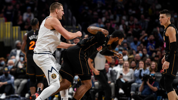 在昨日热火对阵掘金的比赛第四节,约基奇在一次防守中愤怒推倒大莫里斯。赛后双方球员还引发了新一轮的争吵。