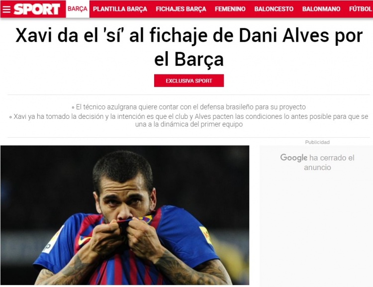据《每日体育报》透露阿尔维斯即将重返巴萨,双方目前努力敲定合同的细节。据俱乐部人士消息,双方最后一次会面确认了阿尔维斯再次披上巴萨战袍的可能性。如果哈维同意这笔转会,阿尔维斯有望出战下周对阵西班牙的加泰罗尼亚德比。