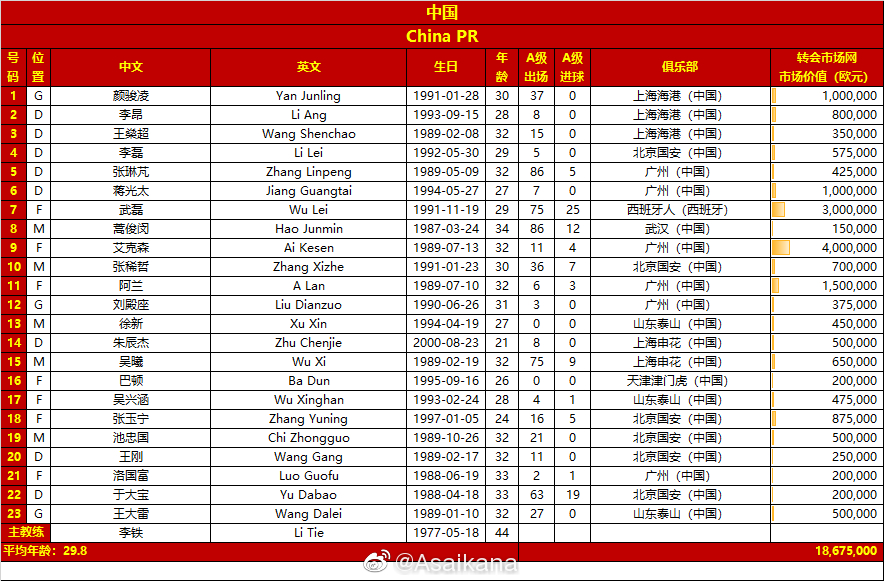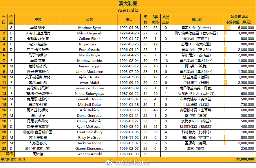 中国队身价最高的是400万欧元的艾克森。而曾经身价一度达到1000万欧元的武磊,被誉为”全村的希望“,现已跌至300万欧元。澳大利亚身价最高的球员则是效力于西甲皇家社会队的门将马修-瑞安,达到600万欧元。