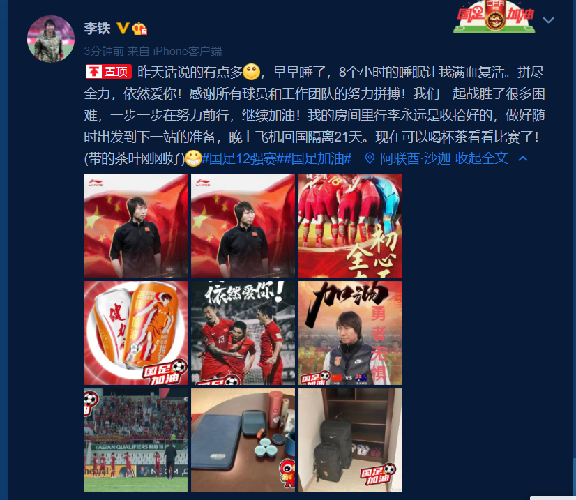 李铁说道:“昨天话说的有点多,早早睡了,8个小时的睡眠让我满血复活。拼尽全力,依然爱你!感谢所有球员和工作团队的努力拼搏!我们一起战胜了很多困难,一步一步在努力前行,继续加油!我的房间里行李永远是收拾好的,做好随时出发到下一站的准备,晚上飞机回国隔离21天。现在可以喝杯茶看看比赛了!(带的茶叶刚刚好)”