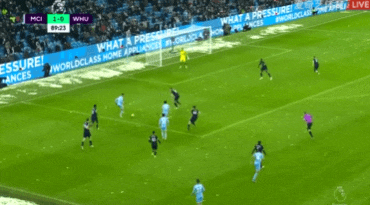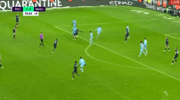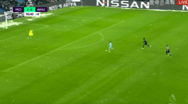 第33分钟,坎塞洛长传将球送入禁区,马赫雷斯横传中路,京多安混乱中伸出一脚抢点破门!曼城1-0西汉姆联。