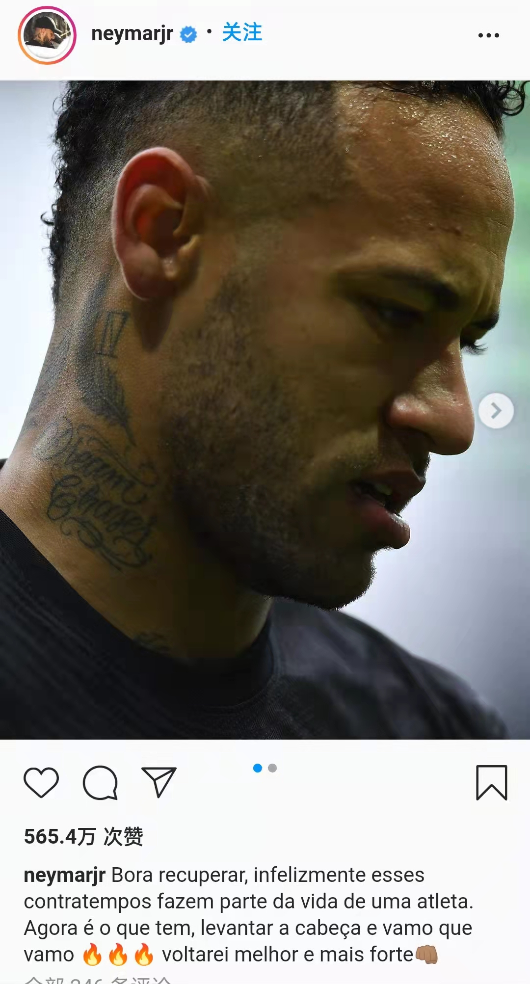 比赛结束后他在社交媒体上发文谈到了感受:”开始恢复吧!很不幸,但这些挫折是运动员生涯的一部分。现在要抬起头来,继续加油。我会以更好和更坚强的姿态归来。“