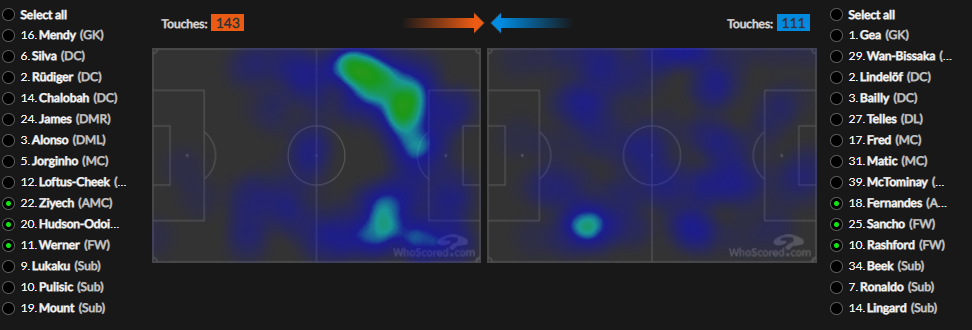虽说数据不能说明一切,但它却毫无保留地反映出了两支球队的战术意图:蓝军是控球+围攻,面对铁桶阵用射门数量换质量,虽然最后的质量也不怎么高;曼联是分解式防守反击,前45分钟防守,后45分钟反击,把最趁手的家伙式都藏在兜里,等待时机搞一手不讲武德的突然袭击,虽然秘密武器最终就如同鲤鱼王用水溅跃,没有什么效果。