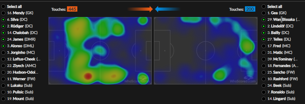 我们不妨再看一看两队的三叉戟&防线热区对比图:切尔西的进攻三剑客长时间在曼联家门口遛弯乘凉,时不时地按个门铃恶作剧一下,曼联的三叉戟大部分时间却只能退在本方半场;切尔西的整条防线基本覆盖了中后场,双翼卫在对手禁区线附近长期驻扎,曼联这边除了万-比萨卡能够经常过半场袭扰一番之外,都只能被死死钉在中场线以后。两队中后场的触球次数也足以说明,蓝军在控球率方面占据着绝对的上风,而曼联则有意将球权让渡,死死地把住城门。