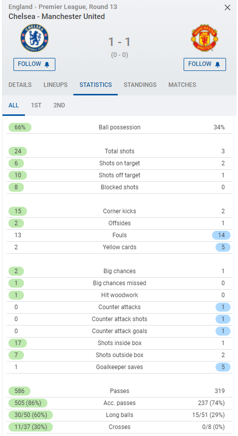 本场比赛在数据方面蓝军占据绝对优势,但最终的结果却多少有些出人意料:蓝军全场占据了三分之二的控球率,24脚打门6次射正,最终却只凭借着一粒点球撬开了德赫亚的十指关;曼联仅有三分之一的控球权,3脚打门2次射正,最终是凭借着对手送上的乌龙助攻完成反击破门。