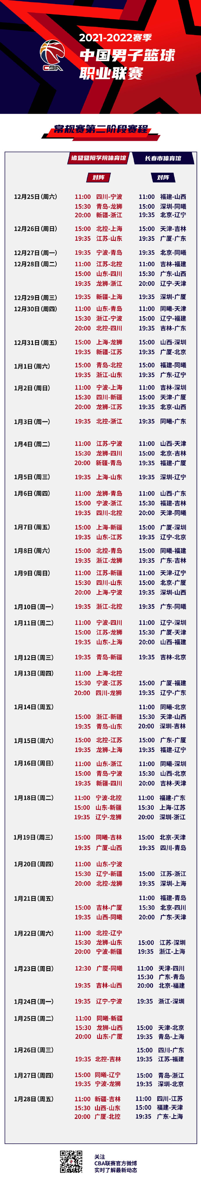 官方公告如下:2021-2022赛季中国男子篮球职业联赛(以下简称“CBA联赛”)常规赛第二阶段将于2021年12月25日-2022年1月28日在浙江省诸暨市和吉林省长春市举行。