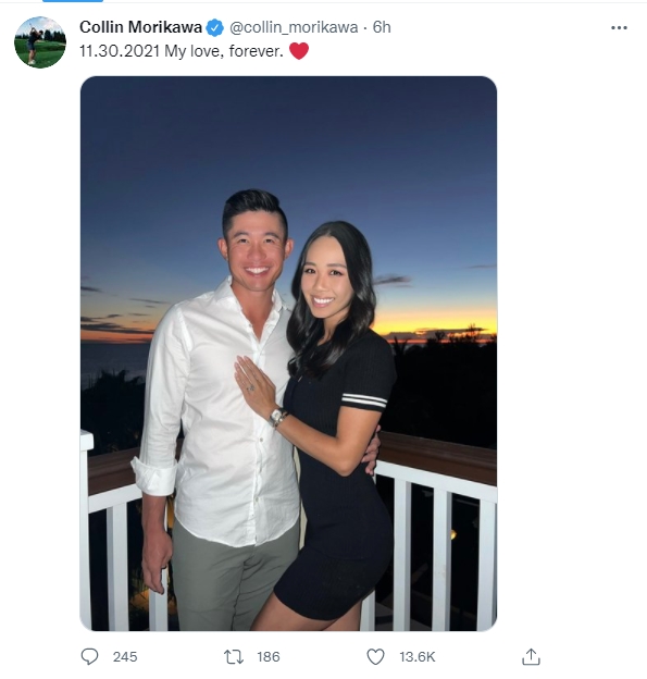 北京时间12月2日,新科迪拜竞赛总冠军、现世界第二的高尔夫球手科林·森川在国外社媒上宣布喜讯,与向女友朱凯琳求婚成功。