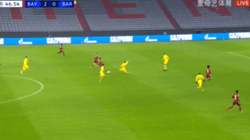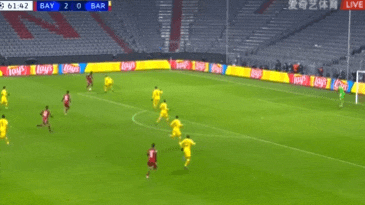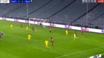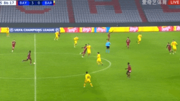 第34分钟,莱万禁区内连续晃动后挑传中路,穆勒头球攻门,皮球虽被阿劳霍解围但此前已越过门线!拜仁1-0巴萨。
