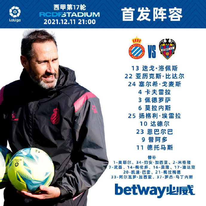 北京时间12月11日21:00,西甲联赛第17轮,西班牙人主场迎战莱万特,赛前首发公布,武磊替补待命。