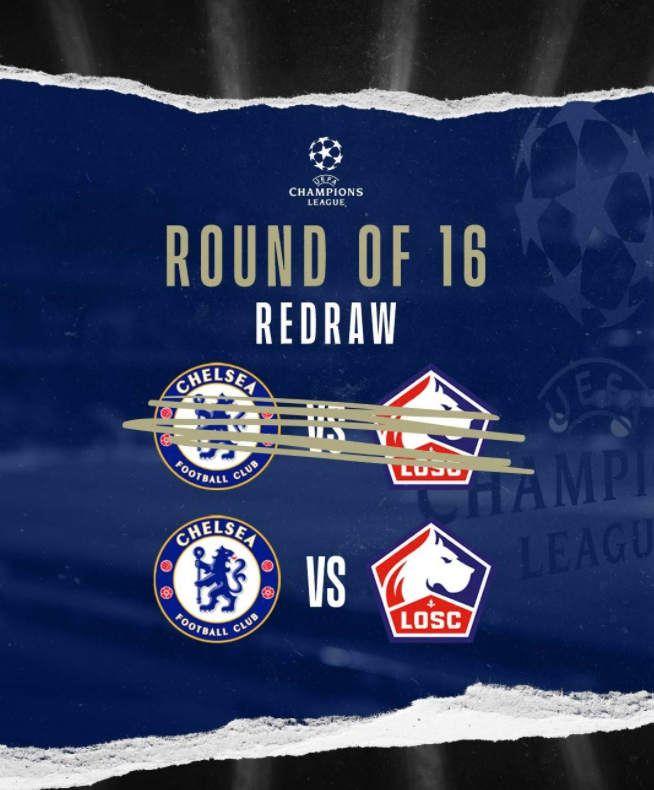 在北京时间12月13日晚间进行的2021/22赛季欧冠1/8决赛抽签中,由于抽签过程失误,欧足联不得不在多支球队的抗议之下决定重新抽签。然而阴错阳差的是,第一次抽签中便与里尔相遇的切尔西在第二次抽签中依然抽中了里尔,对于这个“上上签”,切尔西官方社交媒体也发布了一张海报予以调侃。