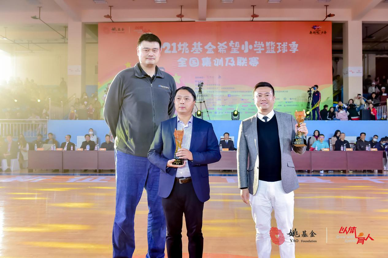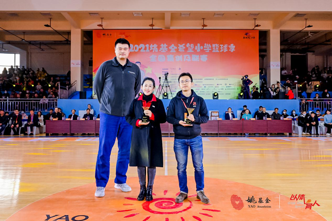 姚基金创始人、副理事长姚明为中国人寿颁发姚基金希望小学篮球季·十届特别致敬——兼爱奖;为万豪国际集团颁发姚基金希望小学篮球季·十届特别致敬——嘤鸣奖。
