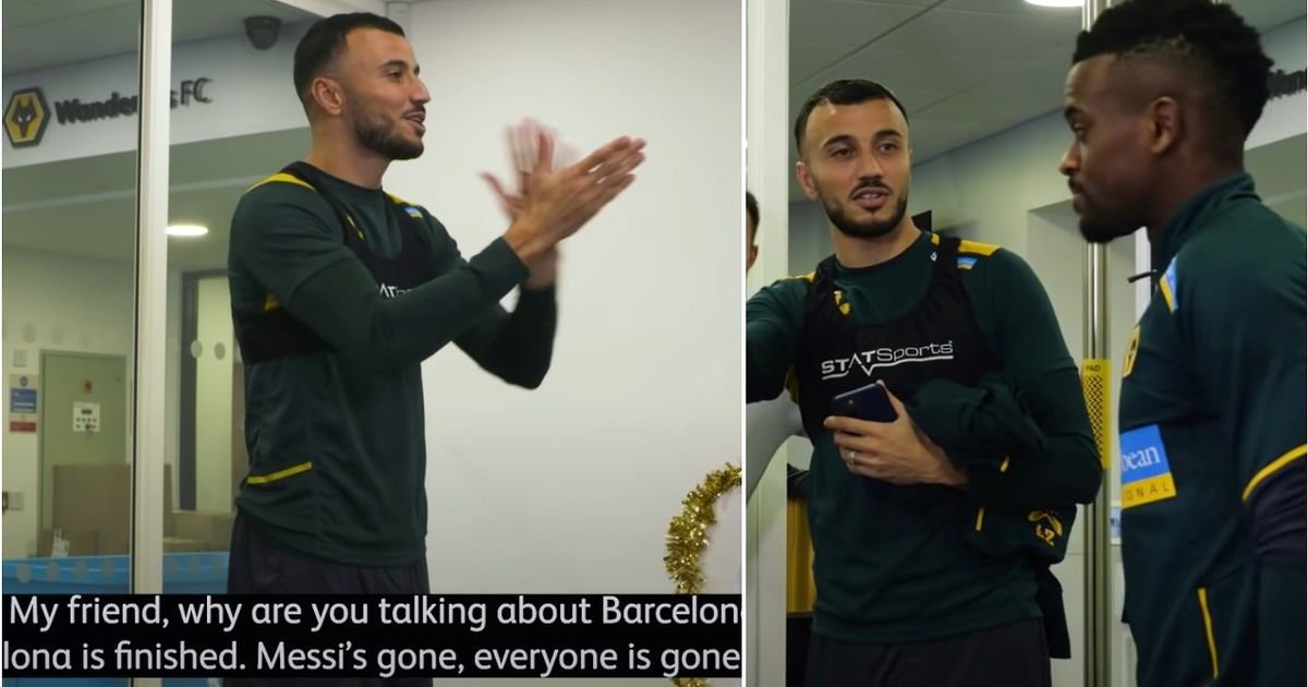 视频显示,狼队的摩洛哥后卫赛斯对塞梅多说:“哥们儿,你怎么还在说巴萨啊?我的朋友,巴萨已经完蛋啦,梅西走了,队里的人都走没了!”