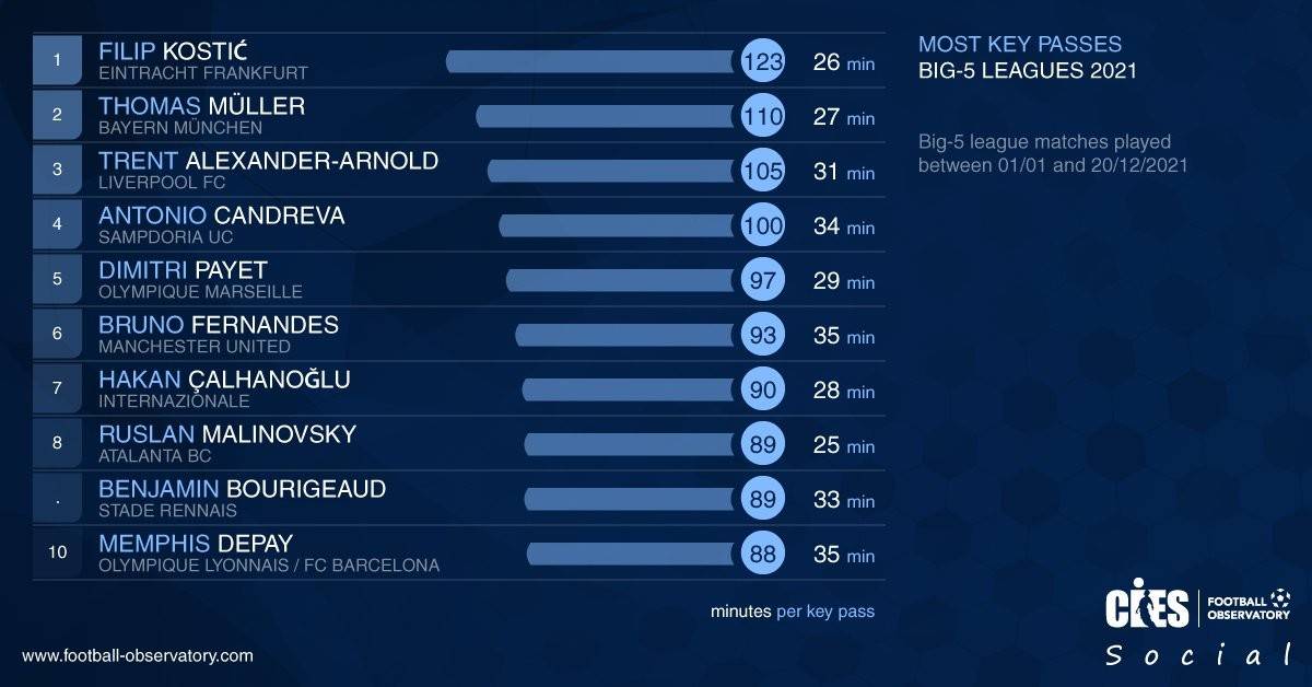 根据权威数据机构足球天文台(CIES)的统计,2021年五大联赛球员关键传球次数排名基本确定(部分球队年内还有比赛)。