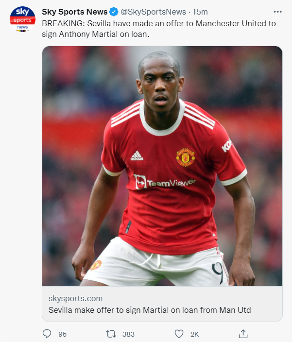 据天空体育报道塞维利亚向曼联报价,租借马夏尔到本赛季结束。这一报价并不包含买断条款。目前曼联俱乐部并没有对塞维利亚的报价进行回应。
