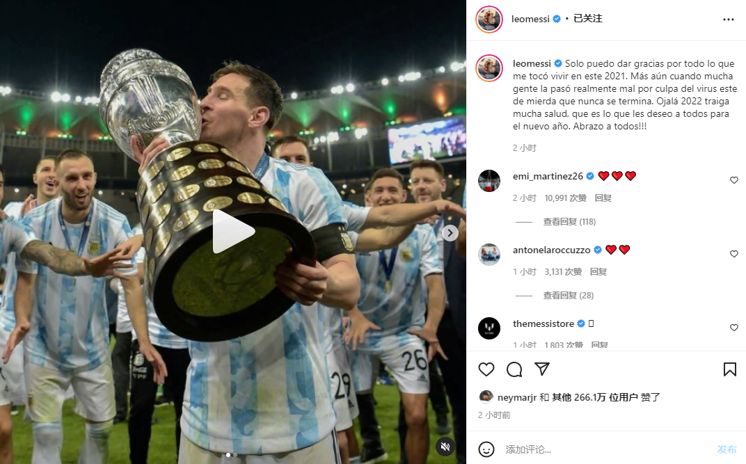 梅西写道:感谢我们在2021年所必须经历的一切,因为这该死的疫情总是没完没了,很多人因此度过了非常糟糕的日子。希望2022年大家都健康,这就是我对大家的新年祝福了,抱抱!!