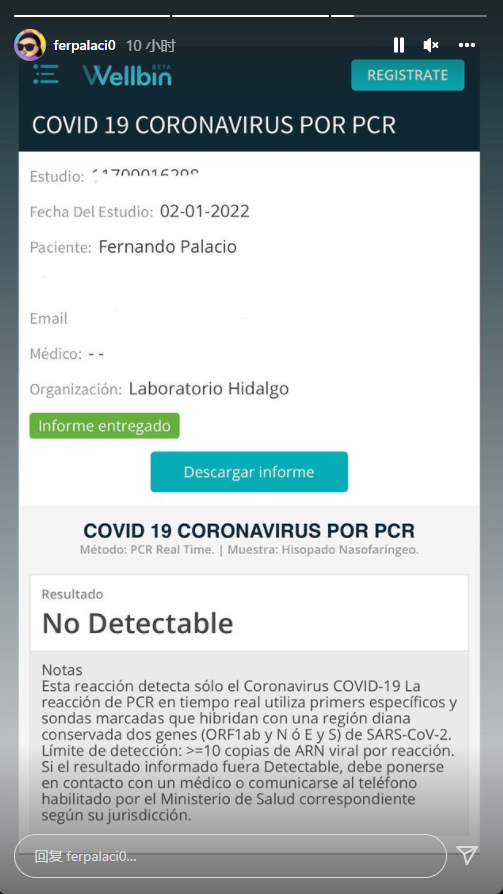 对于这名DJ称:“我收到了很多私信,他们甚至称我为刺客。因为我明天必须前往乌拉圭,昨天做了新冠检测,但我没有感染,我现在就给你们看。”随后Fernando Palacio将自己新冠检测的核酸报告发布到了个人社交平台之上,其核酸检测结果为阴性。