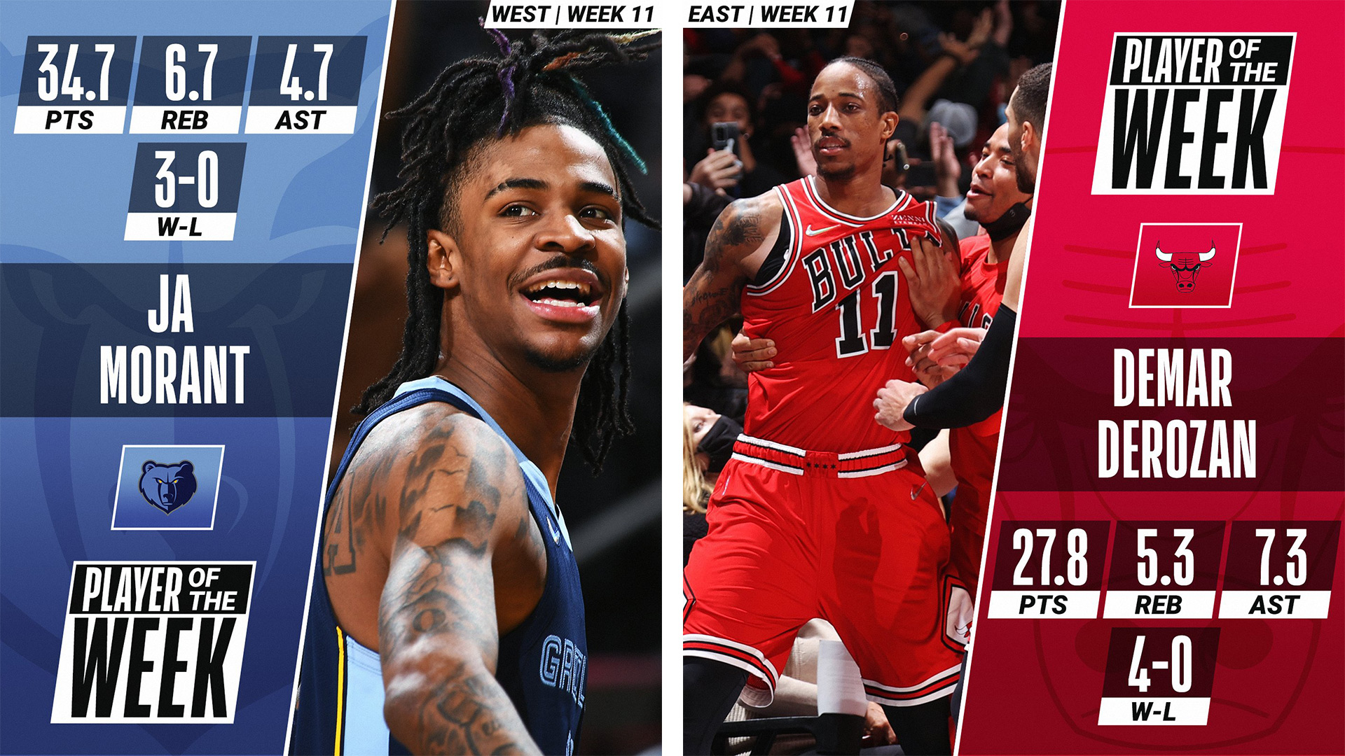 北京时间1月4日,NBA官方公布了第11周周最佳球员。芝加哥公牛后卫德罗赞和孟菲斯灰熊后卫莫兰特,分别当选上周东、西部周最佳。德罗赞带领公牛队4战全胜,场均贡献27.8分5.3篮板7.3助攻,其中个人连续两场上演三分压哨绝杀成为NBA史上第一人!